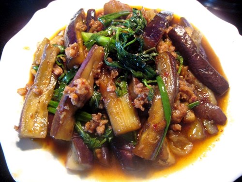 Cà tím 500g, gừng tươi 4 lát, tỏi 3 củ. Cà cắt dọc dài. Gừng thái lát, tỏi nghiền trộn nước tương, dầu, muối, đường. Chưng cách thuỷ. Có tác dụng thanh nhiệt hoá đàm nhiệt.