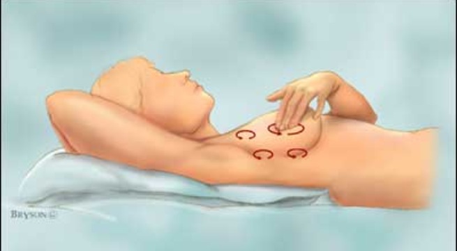 Vú chia làm 4 phần, khám từ 1/4 trên trong. Bắt đầu từ nền xương ấn nhẹ nhàng nhưng dứt khoát, day tròn bằng bàn tay tìm kiếm khối u hoặc mảng dày hay bất thường nào khác, khám núm vú từ từ nhẹ nhàng lật đi lật lại kỹ quanh núm vú. Tương tự khám ¼ dưới bắt đầu từ phần nền xương và cũng từ các xương sườn dưới vú và lại khám nhẹ nhàng đầu vú. Bạn sẽ thấy ở phần chóp có tổ chức mềm, điều này hoàn toàn bình thường.
