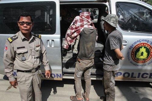 Một người đàn ông gốc Việt bị Cảnh sát Phnom Penh áp giải lên xe vì không xuất trình được giấy tờ ngay lập tức.