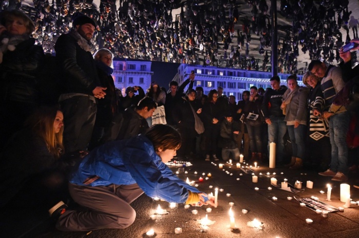 Mọi người tụ tập để thắp nến dưới tấm gương lớn ở Marseille, Pháp để cầu nguyện cho 12 thiệt mạng trong vụ thảm sát tòa soạn báo ở Paris.