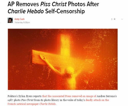 Trang Gawker.com đưa tin, ngay sau cuộc tấn công nói trên, hăng tin AP cũng đă gỡ bức h́nh chụp cây thánh giá với tượng Chúa Jesus bị đóng đinh, trong thư viện h́nh ảnh của ḿnh. Trong khi đó, tờ The Wall Street Journal (Mỹ) khi đăng tin về vụ tấn công ṭa báo Charlie Hebdo đă phải loại những ảnh có tranh biếm họa về Mohammad.