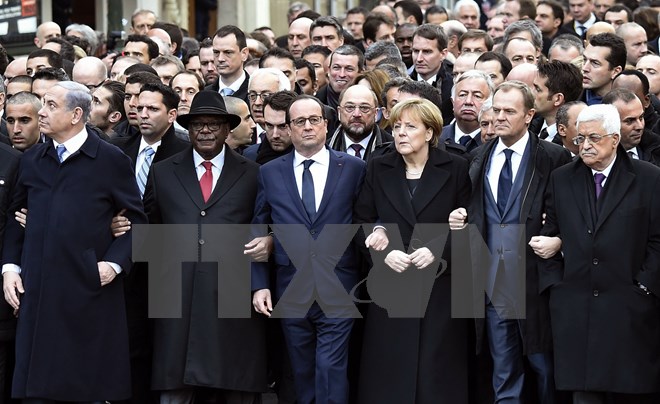 Khoảng 40 lãnh đạo thế giới và hơn 1 triệu người đã đổ xuống các đường phố ở Paris để tham gia cuộc tuần hành quy mô lớn nhằm bày tỏ đoàn kết sau khi 17 người thiệt mạng trong loạt tấn công khủng bố trong 3 ngày liên tiếp, vốn làm rúng động thủ đô của Pháp.