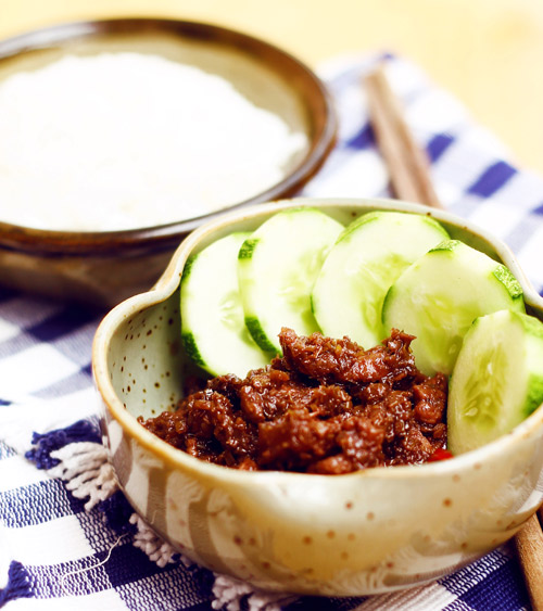- Dọn thịt xào mắm ruốc ra ăn cùng với cơm và dưa leo.