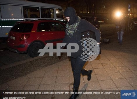 Một thành viên của một lực lượng cảnh sát đặc nhiệm mang theo một máy tính bị tịch thu sau cuộc tấn công chống lại các thánh chiến ngày 16/1/2015 tại Berlin