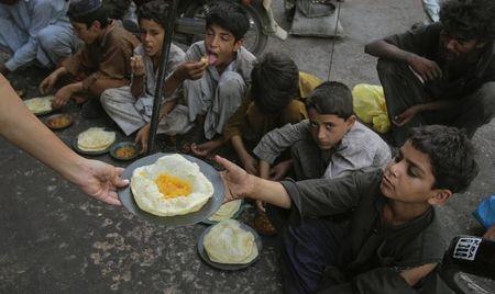 Trẻ em nhận thực phẩm miễn phí trên đường phố ở Pakistan.