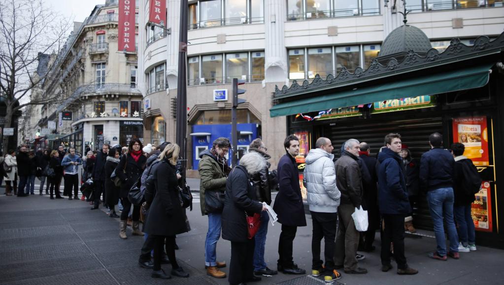 Người dân Pháp xếp hàng mua số báo mới Charlie Hebdo sau vụ thảm sát để bày tỏ tình liên đới. REUTERS/Stephane Mahe
