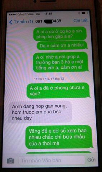Số máy từ nữ doanh nhân: Thôi e cũng chẳng hợp làm việc với a đâu, cũng sẽ không bao giờ làm việc nữa a cho e xin lại phong v́ mà mấy lần e đưa cho a, a cũng nói giúp a trường trưởng ban giúp e. Phong v́ e đưa doi với các a ko nhieu, nhưng là mà đối với e th́ rất quan trọng, nén a gũi lại cho e nhé!!! Nếu a có cho thêm e th́ tốt v́ e rất nghèo a ạ!