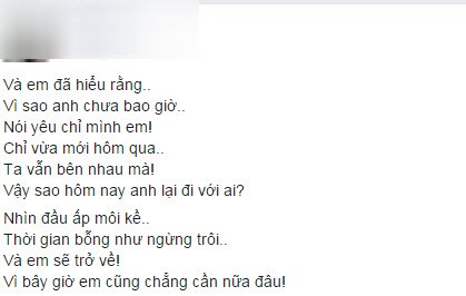 Sau khi chia tay bạn trai, N.M viết: “Trước đây, tao nghĩ cuộc đời này rất tươi đẹp, rất hạnh phú. Nhưng khi lớn lên, ra xã hội và va chạm nhiều lần, tao mới biết cuộc đời không tươi đẹp như tao nghĩ. Nó chỉ có trong mơ thôi, không có ngoài đời thật đâu. Trước kia khi yêu, tao hạnh phúc lắm. Lúc nào cũng muốn ở bên cạnh mày nhưng bây giờ tao đã bình thường. Tao đã học được rất nhiều từ mày. Phải thật nhẫn tâm và thật dứt khoát đúng không. Chúng mày có bao giờ nghĩ đến cảm nhận của tao không. Có bao giờ biết cảm thông cho tao không và có bao giờ mày hiểu suy nghĩ của tao không. Chưa bao giờ tao dám giận mày vì tao yêu máy quá nhiều nhưng tao càng yêu mày, mày càng được đà giận dỗi đủ kiểu. 1 tí là nói lời chia tay. Vậy bây giờ tao chịu buông tay rồi đấy. Chúc mày hạnh phúc nhé. Tao cũng sẽ tự chúc bản thân phải thật hạnh phúc, hạnh phúc hơn mày. À quên, khi nào mày cưới vợ nhớ mời tao. Tao sẽ đến chúc cưới, nhớ mời tao. Tao sẽ đến chúc mừng và lì xì nhé!”.