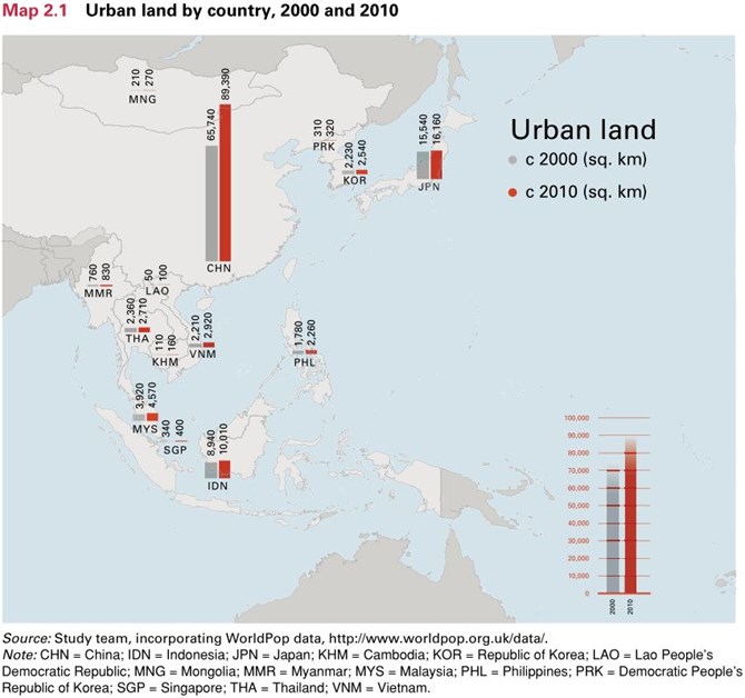 Nhìn chung, đô thị ở Đông Á tăng với tốc độ trung bình 2,4% mỗi năm trong 1 thập kỷ, với tổng diện tích đô thị vào năm 2010 là 134.800 km2 vào năm 2010.