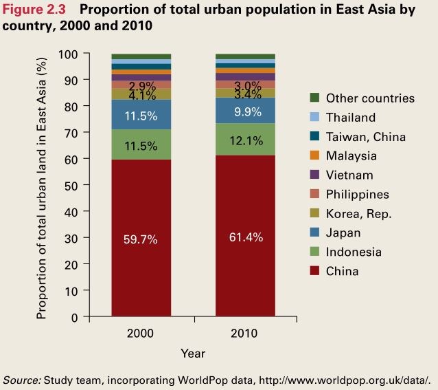 Nhìn chung, tỷ lệ dân số thành thị tăng nhanh hơn đất đai tại Đông Á. Tổng dân tăng từ 579 triệu người vào năm 2000 lên 778 triệu người sau đó 10 năm. Con số này tương đương với số dân của một nước lớn thứ sáu trên thế giới.