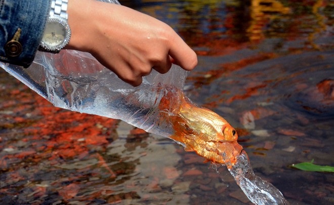 Nhưng khi người dân thả vào bến sông,kênh rạch hay các chùa có hồ nước mà nhiều người nâng niu mỗi khi thả cá,tại các điểm thả cá hai bên các con sông, rạch, hồ... nơi đông người đổ về phóng sinh cá lại là nơi tập trung đội quân bắt cá bằng các phương tiện như chích điện, chài, vợt... Họ bắt cá ngay khi chúng vừa được thả xuống trước mặt chủ nhân.