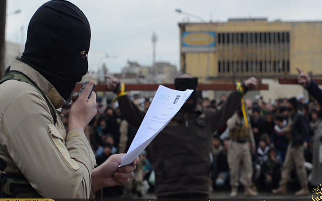 Một chiến binh IS đeo mặt nạn đọc bản luận tội người đàn ông đang bị trói trên một cây thánh giá giữa nơi công cộng ở thành phố Mosul, Iraq. Nạn nhân sau đó bị bắt chết trước sự chứng kiến của nhiều người. Ảnh: Christianpost