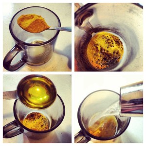 Trộn một thìa cà phê bột nghệ với 1/4 muỗng cà phê dầu ô liu và thêm một ít hạt tiêu. Khuấy đều hỗn hợp và sử dụng nó như là một gia vị bổ sung cho bữa ăn hoặc bạn có thể dùng nó một cách riêng biệt. Khi bạn thêm nó vào trong thực phẩm, hãy chắc chắn rằng bạn làm điều này ngay trước khi tắt bếp để tránh sôi nó bị quá nhiều. Nếu bạn ăn nó một cách riêng biệt, bạn nên thêm một ít nước. Bạn nên ăn hỗn hợp mỗi ngày và thường xuyên càng tốt.