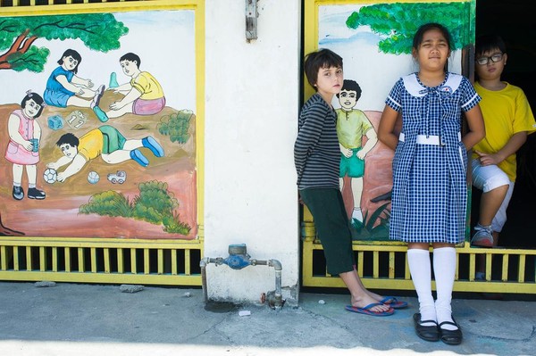 Peter cùng 2 người bạn đang đứng bên ngoài trường học ở Balibago (Philippines). 4 trong số 50 học sinh tại trường học này có cha là người Úc.