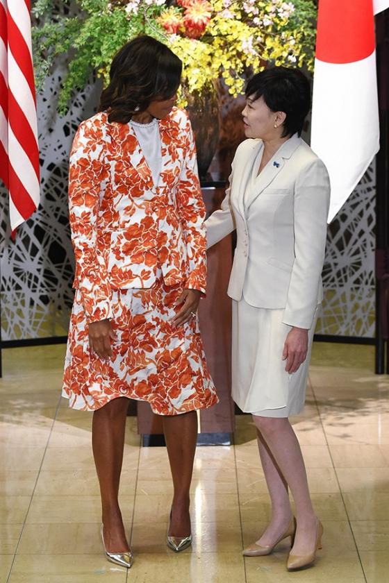 Cùng ngày, Michelle Obama diện váy hoa Carolina Herrera và giày Jimmy Choo dự một sự kiện ở Nhật Bản.