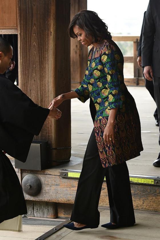 Ngày 20/3, Đệ nhất phu nhân Mỹ tới thăm đền Kiyomizu ở Kyoto, Nhật Bản trong áo khoác họa tiết của Dries van Noten kết hợp chiếc quần ống rộng.