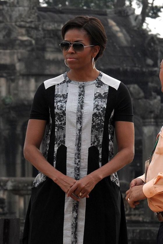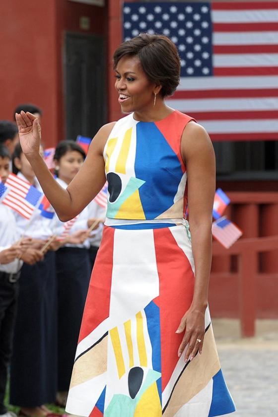 Ngày 21/3, Michelle diện áo và chân váy đa sắc của Alice + Olivia trong chuyến thăm một trường học ở Campuchia.