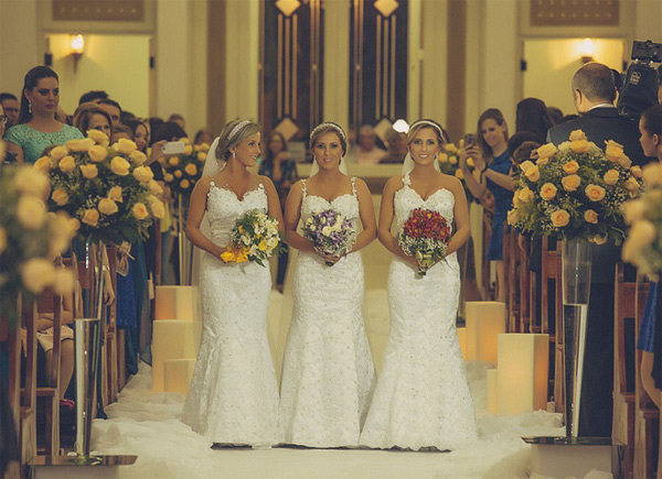 Cuối tháng 3 vừa qua, Rafaela, Rochele và Tagiane Bini sống ở Passo Fundo (miền Nam Brazil) cùng nhau tổ chức đám cưới. Ba cô gái sinh ba năm nay 29 tuổi, có cùng ngày sinh nhật, chung dáng vẻ bề ngoài và sở thích, đã quyết định chọn váy, kiểu tóc, trang điểm giống nhau.