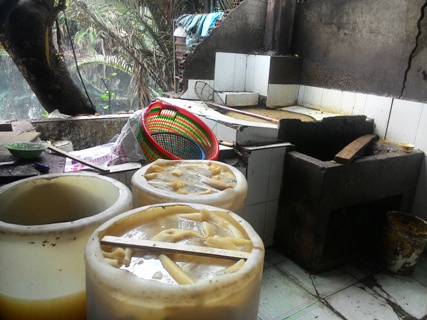 Cả 3 đối tượng khai nhận đã từng sản xuất bì lợn ngâm hóa chất nhiều năm nay tại một địa điểm ở quận 6 và chuyển lên thuê ở đây được một năm nay. Bằng công nghệ ngâm tẩm hóa chất, cả 3 mua da lợn không đảm bảo chất lượng từ chợ đầu mối Bình Điền về lột mỡ, luộc sơ qua nước nóng, sau đó ngâm hoá chất tẩy trắng và hóa chất tạo nở từ 3 đến 5 ngày. Sau khi được ngâm qua hóa chất, da lợn sẽ tăng trọng lượng và sẽ được cắt sợi để làm bì bán cho các quán ăn chuyên bán cơm tấm.