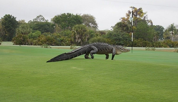 Có hàng trăm con cá sấu sống ở các đầm lầy xung quanh sân gôn Myakka Pines ở Englewood, Florida. Nhưng ngày 6/3/2015, một con cá sấu khổng lồ đã xông thẳng lên sân gôn. Theo nhiều người chơi, con động vật hoang dã này “chiếm cứ” lỗ gôn số 7. Một bức ảnh chụp lại cho thấy nó “to như con khủng long”. Còn phía bảo vệ sân gôn nói rằng, con cá sấu chỉ dài khoảng… 4 mét.
