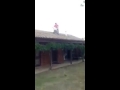 Có lẽ xem quá nhiều phim hành động với các cảnh đua xe nên 2 người đàn ông này đã lên một chiếc xe máy đứng trên nóc ngôi nhà mái ngói. Sau đó người cầm lái tăng ga, xe lao cắm đầu và tiếp đất cực mạnh.