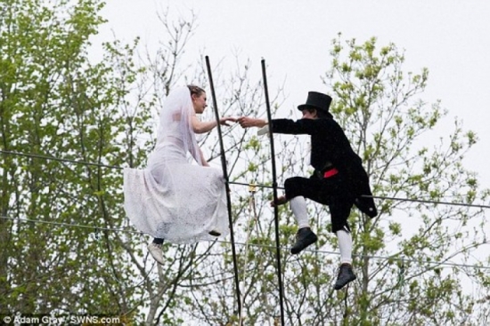 Một cặp đôi người Anh vừa tổ chức một đám cưới độc đáo trên dây. Họ vừa đu dây vừa làm những động tác yêu thương lãng mạn mạo hiểm như thề non hẹn biển, trao cho nhau nụ hôn nồng thăm trên cao 24m, còn khách tham dự ngồi bên dưới.