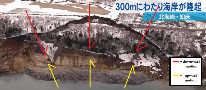 Một người phụ nữ địa phương, người đã thu hoạch rong biển dọc theo bờ biển vào sáng 26/4 nhận thấy khu vực này đã trở nên cao hơn bình thường. Chủ tịch Hiệp hội Hợp tác xã Thủy sản Rausu, Katsuhiro Tanaka cho biết: “Người dân địa phương cho biết không nghe thấy bất kỳ âm thanh và chấn động nào”.Tuy nhiên, cuối cùng người ta cũng phát hiện ra nguyên nhân của hiện tượng này là do một vụ lở đất lớn. Các nhà nghiên cứu ở Hokkaido phát hiện một phần của một quả đồi nằm ở bờ biển đã sạt lở theo tin tức của Asahi Shimbun. Theo đó, một con đường ven đồi nằm cách bờ biển 150m đã sạt lở khoảng 30m.Theo Shintaro Yamasaki, trợ lý giáo sư về công nghệ kỹ thuật tại Viện Công nghệ Kitami ở Hokkaido cho rằng vụ sạt lở đất đã khiến đất rơi xuống đáy biển và cuối cùng nó làm bề mặt đáy biển được nâng cao thêm.