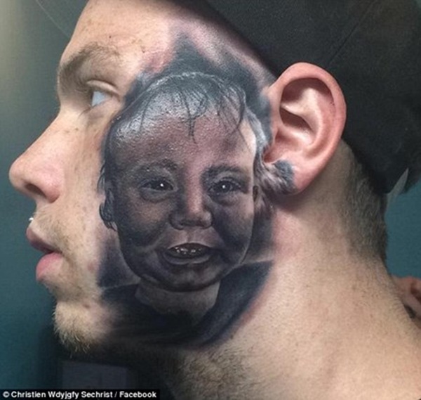 Được biết, ngoài hình xăm con trai trên má trái, “tín đồ xăm hình” còn có một hình xăm lớn khác bên phải mặt.