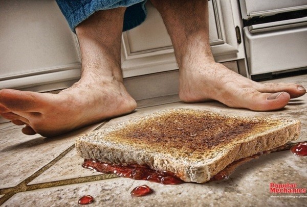 Cùng với đó, bánh mì nướng là thực phẩm ít có khả năng bị xâm nhập vi khuẩn từ bất kỳ loại bề mặt sàn nào. Bởi do có hàm lượng nước thấp, khả năng bánh bị vi khuẩn bám vào không đáng kể dù nằm trên mặt sàn 3, 5 hay thậm chí 10 giây. Tuy nhiên, bánh mì nướng có kèm bơ hay mứt lại làm tăng khả năng vi khuẩn bám vào đồ ăn.