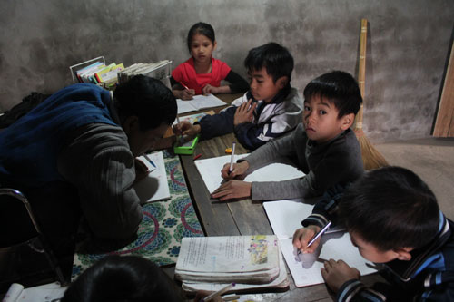 Sau giờ tan học chính ở trường là các em về dựng xe trước hiên và ngồi ngăy ngắn ở bàn học thầy giáo Trường. Không để thầy giáo nhắc, cả 9 em học sinh ngồi đúng vị trí lấy sách môn Tiếng Việt ra học và tập viết.