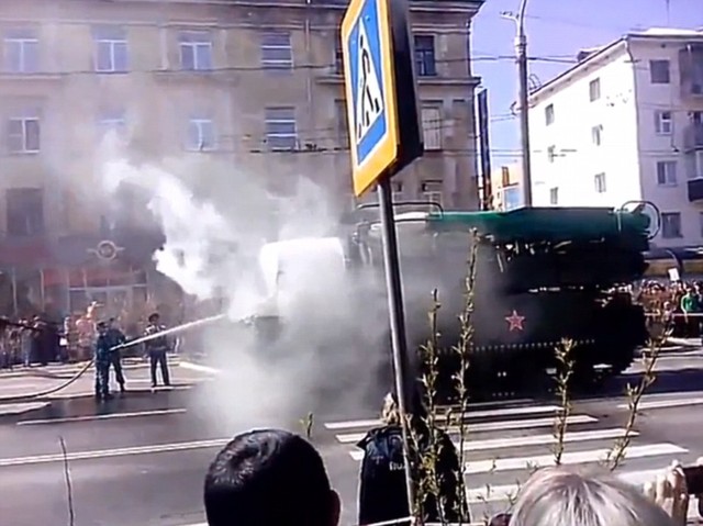 Trong lễ duyệt binh tại Siberia nhân kỉ niệm 70 năm Ngày Chiến thắng, khán giả được một phen kinh hãi khi một chiếc xe chở tên lửa BUK bỗng dưng bốc cháy, khóc bốc mù mịt phần đuôi xe.