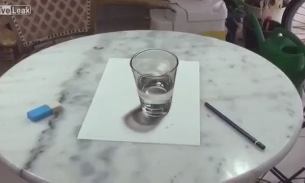 Thêm một tác phẩm 3D tuyệt vời. Bằng kỹ thuật vẽ độc đáo, họa sĩ đã tạo ra ảo giác khiến nhiều người xem lầm tưởng chiếc cốc nước vẽ trên giấy là thật.