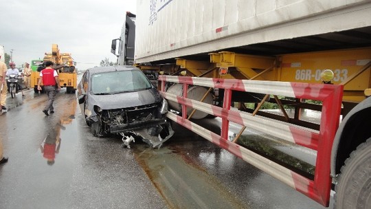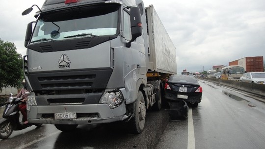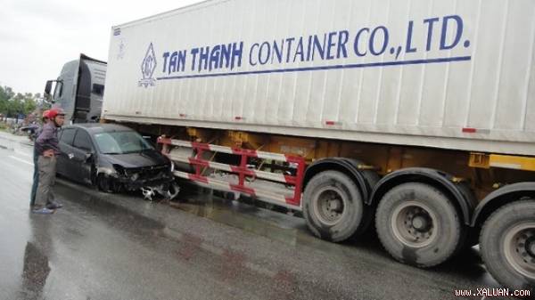 Vụ tai nạn đã làm cho chiếc xe con hư hỏng nặng phần đầu và đuôi, chiếc xe container bị hư hỏng phần đầu.