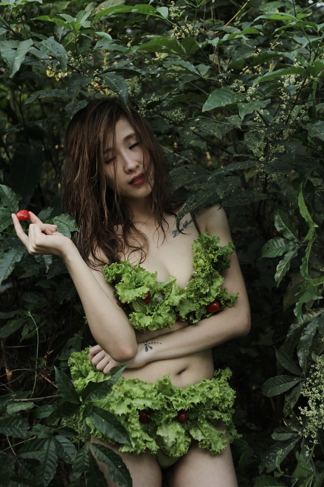 Chưa hết sốc khi hình ảnh một người mẫu Việt mặc bikini làm từ thịt bò sống thì 2 nhà thiết kế Ly Eva và Hà Minh Phúc lại bất ngờ tung ra bộ bikini từ rau sống.