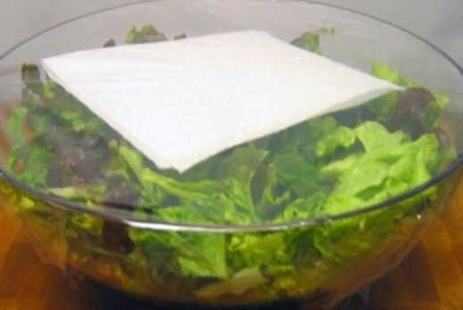 Để một miếng khăn giấy trên chiếc tô chứa đầy rau xà lách và dùng màng bảo vệ thực phẩm bọc lại. Cách làm này sẽ giúp rau xà lách của bạn giữ nguyên độ tươi trong vòng 1 tuần.