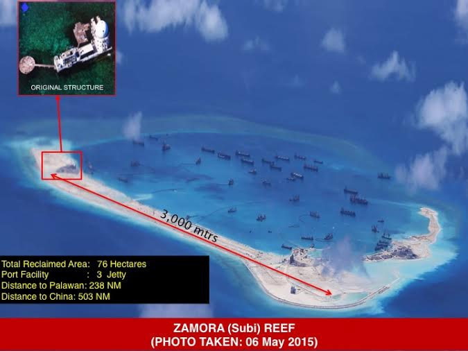 Đảo Zamora (Subi) có diện tích ban đầu là khoảng 1000m2, nay TQ đang khoanh vùng xây dựng với diện tích 76ha. Ảnh chụp ngày 6/5/2015. Bộ Quốc phòng Philippines cung cấp.