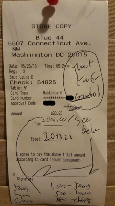 Vị khách còn cẩn thận chia 3 khoản tiền típ của mình cho 3 người bao gồm bếp trưởng nhà hàng (1.000 USD), nhân viên phục vụ Laura Dally và chủ nhà hàng Christofer Nardelli mỗi người được 500 USD.