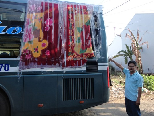 Một xe khách phải dùng vải che chắn lại sau khi bị ném đá vỡ kính Ảnh: CAO NGUYÊN