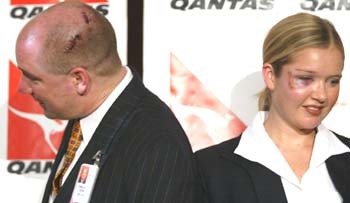 Tiếp viên Denise Hickson và Greg Khan bị thương khi khống chế một tên không tặc. Ảnh: SMH