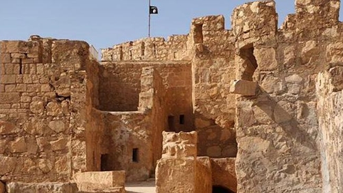 Cờ đen của Nhà nước Hồi giáo (IS) cắm trên đỉnh lâu đài Palmyra. Ảnh: AP.