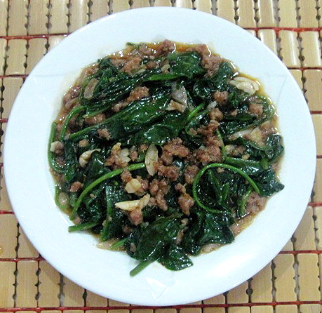 Bò xay xào mồng tơi dùng với cơm nóng rất ngon.