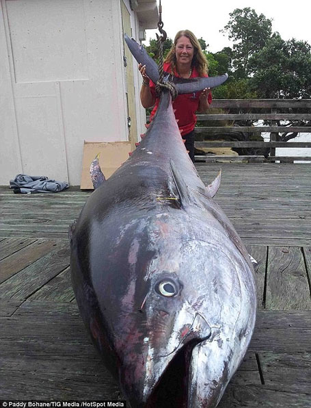 Đó là chiến tích của bà Donna Pascoe khi câu được một con cá ngừ vây xanh Thái Bình Dương nặng tới 411,6kg, ước chừng dài hơn 3m trong chuyến đi câu tại quần đảo Three Kings (New Zealand) hồi năm 2014.