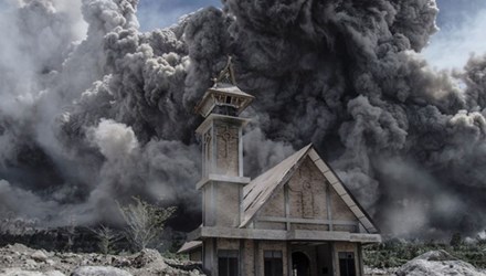 Đám khói bao quanh một nhà thờ bị bỏ hoang ở Karo, Sumatra, Indonesia vào ngày 19/6. Ngọn núi này đã "thức giấc" vào năm 2013 sau nhiều năm ngủ yên.