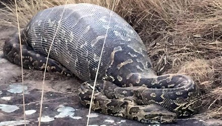 Theo Express, du khách và nhân viên tại Khu bảo tồn Lake Eland, Nam Phi phát hiện xác con trăn dài 3,9m dưới một mỏm đá. Có vẻ như con trăn này đã có một bữa ăn “no nê” trước khi chết bởi bụng nó phình to bất thường.