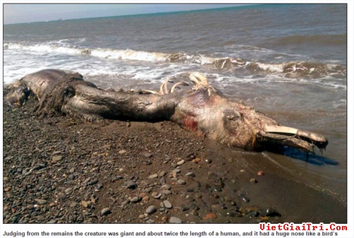 Xác một sinh vật to lớn với hình dạng dị thường vừa trôi dạt vào bờ biển ở vùng Viễn Đông của Nga. Nó có một chiếc mỏ lớn như chim và lông phủ ở phần đuôi. Đến nay, vẫn không ai biết sinh vật này là gì, theo Siberian Times.