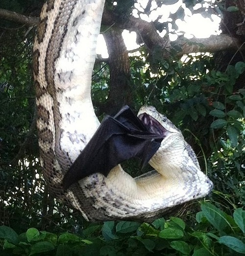 Con yêu quái trăn thuộc cỡ siêu to đang cắn xé một con dơi to không kém được ghi lại bởi vợ chồng Mille Stoevring và Shane Tuer.