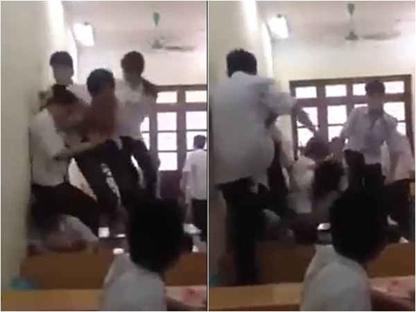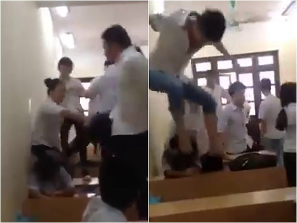 Theo diễn biến được ghi lại trong clip, một nhóm nam sinh tỏ ra hung hăng trèo lên bàn, lần lượt đánh rồi đạp vào đầu một bạn học nữ đang ngồi sụp dưới ghế.