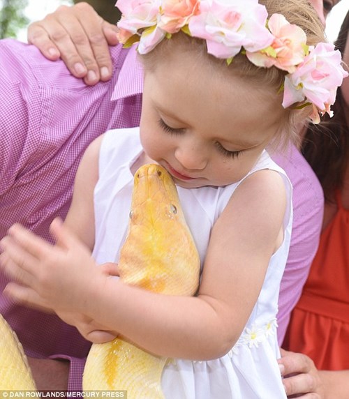 Thế nhưng với cô bé Alisha-Mae-con gái của vợ chồng Rob Cowan và Stacey, con trăn Miến Điện khổng lồ kể trên, chỉ là thú cưng. Cô bé còn để con trăn cuốn quanh người và ôm, hôn nó.