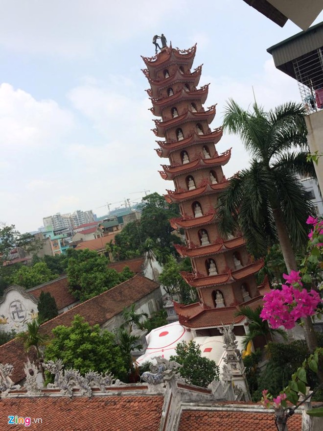 Ông Hùng, người chứng kiến cho biết, 9h một nam thanh niên khoảng 26 tuổi mặc áo kẻ caro leo lên tòa tháp 11 tầng trong khuôn viên chùa Làng Cót (phường Yên Hòa, Cầu Giấy, Hà Nội). Lên đỉnh tháp, người này la hét, chửi thề, rút thắt lưng đập vỡ ngói.