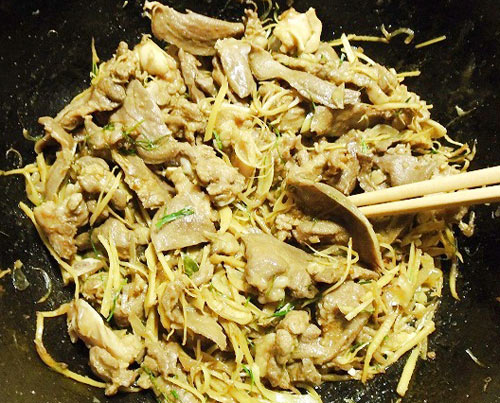 Cuối cùng nêm mì chính cùng ít lá chanh thái nhỏ. Xúc lưỡi heo xào riềng sả ra đĩa.